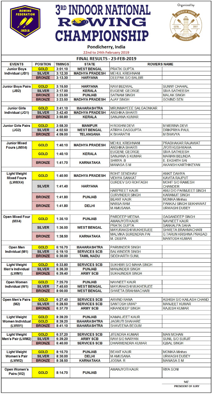 43rd JUNIOR NATIONAL ROWING CHAMPIONSHIPS 1000 METERS AT CHANDIGARH-2023 07TH~08TH dECEMBER 2023
